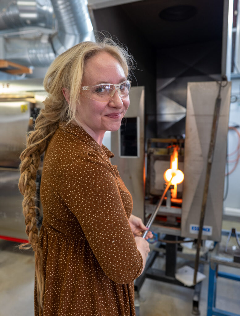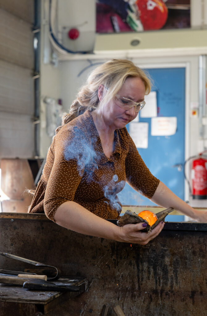 Lasinpuhaltaja Aada Vainio on ensimmäisiä opiskelijoita, jotka suorittavat taideteollisuusalan erikoisammattitutkinnon lasinpuhalluksessa Ikaalisten käsi- ja taideteollisuusoppilaitoksessa.