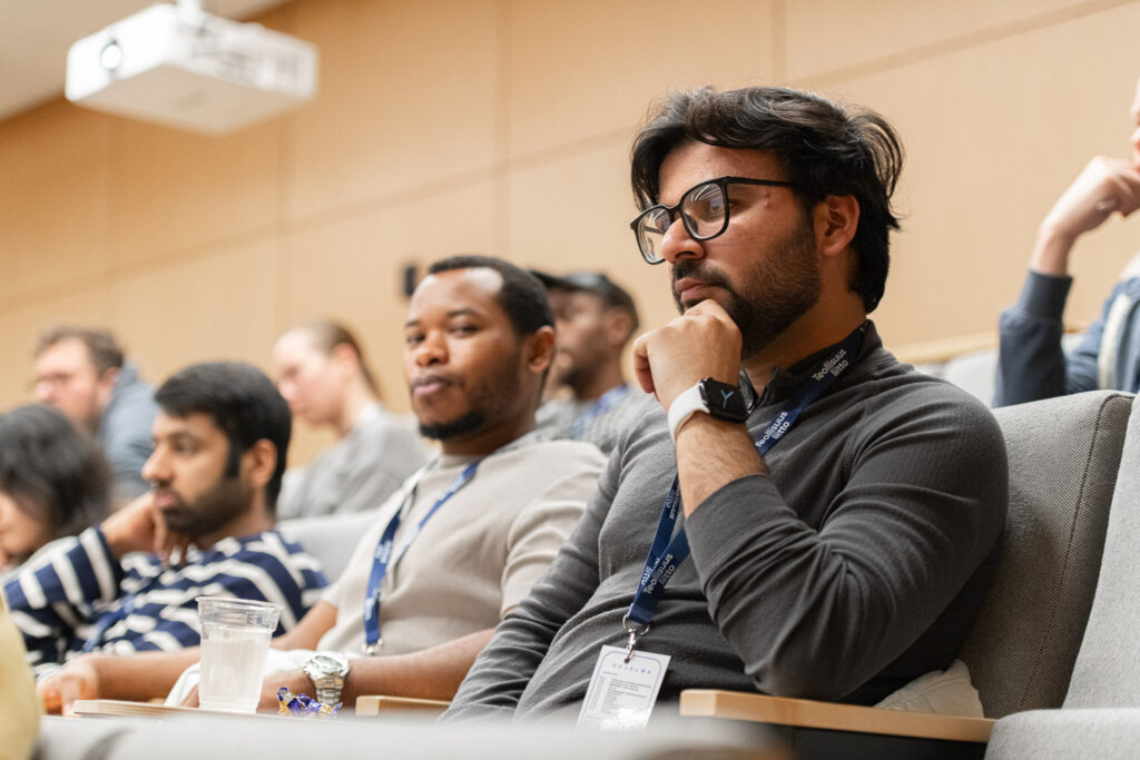 Opiskelija Iina Viljamaa kuuntelee tarkasti, kun Teollisuusliiton yhteiskuntasuhteiden päällikkö Timo Nevaranta puhuu ammatillisen koulutuksen tilasta Murikan auditoriossa.