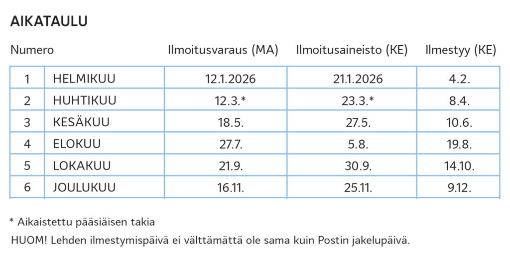 Oheisesta mediakortista näet Tekijä-lehden ilmoituskoot ja ‑hinnat sekä ilmestymisaikataulun ja aineistopäivät vuodelle 2026.