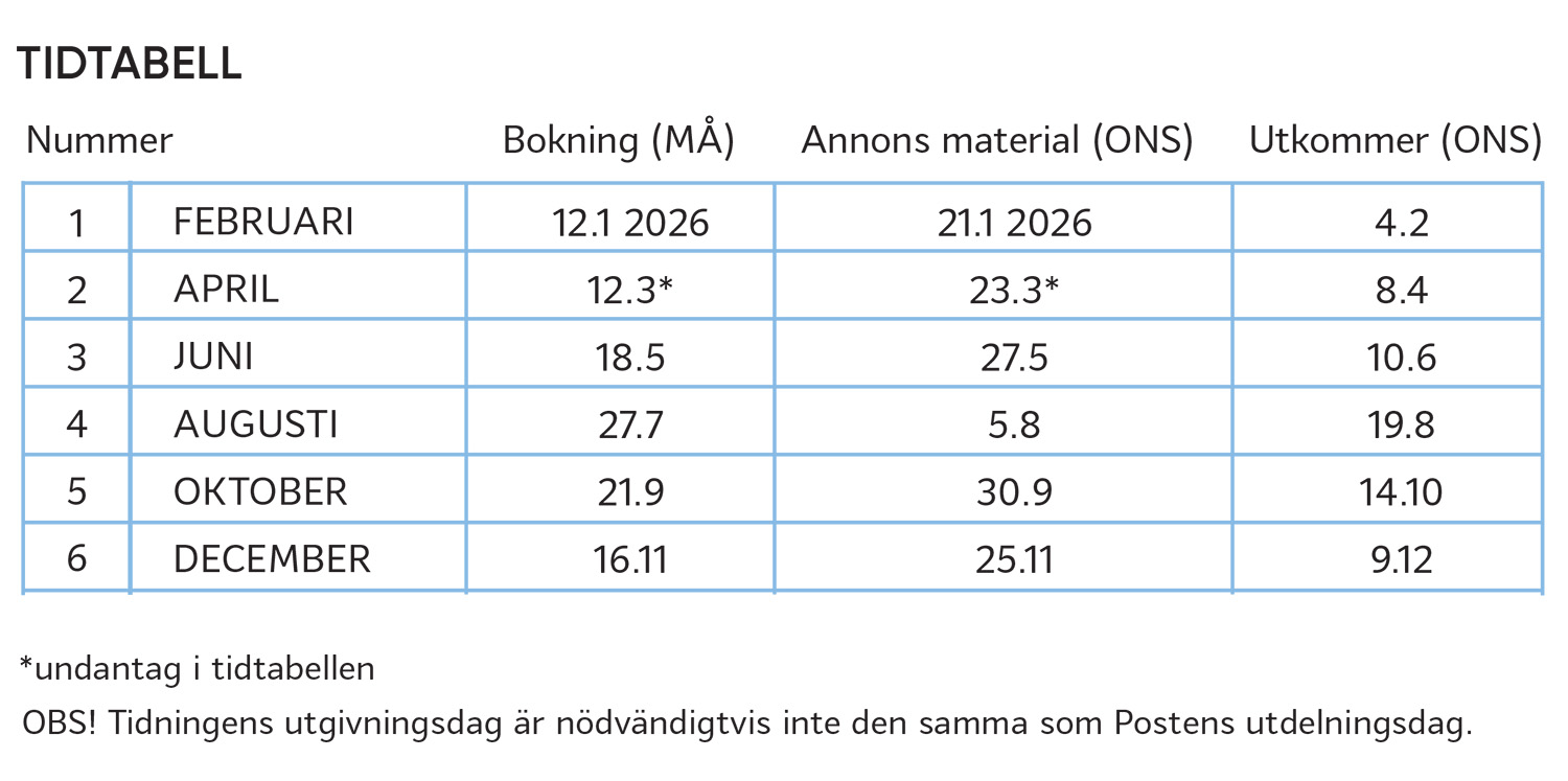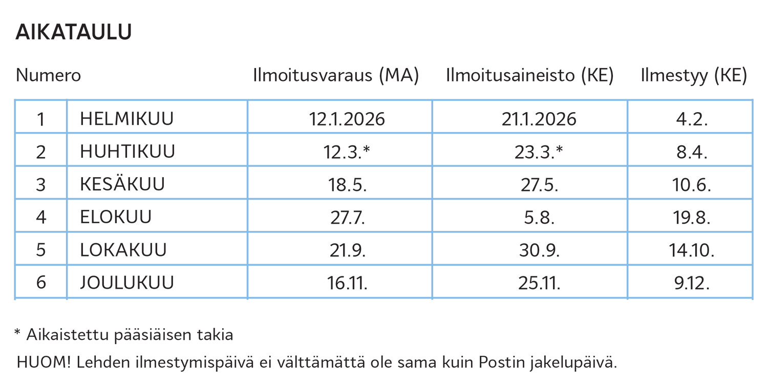 I det bifogade mediekortet framgår tidningen Tekijäs annonsstorlekar och ‑pris samt utgivningsdatum och materialtidtabell för år 2026.