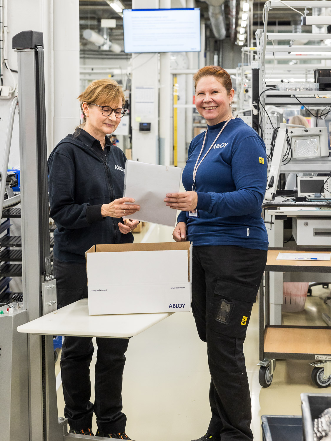 Tuija Ikonen ja Hanne Rantala kertovat, että kokoonpanossa toimitaan tilausten mukaan. Jossain tilauksessa voi olla neljä lukkoa, toisessa neljä tuhatta.