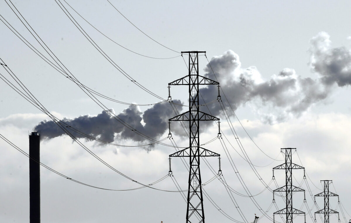 Taivasta vasten näkyy sähkölinja, jossa on monta sähkökaapelia. Vasemmalla on korkea savupiipu, josta tulee savua. Tuuli kuljettaa savua oikealle.