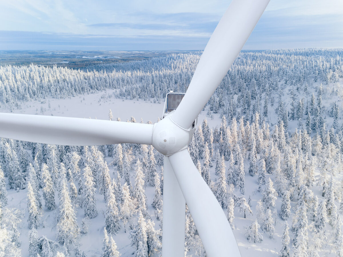 Lähikuva tuulivoimalasta. Takana näkyy lumista metsää.