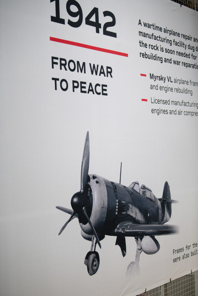 Linna­vuoren mootto­ri­teh­taan 6. hallissa kerro­taan kävijöille, että tehtaan tuotanto alkoi VL Myrsky II ‑hävit­tä­jä­len­to­ko­neen rungon kokoa­mi­sella vuonna 1944.