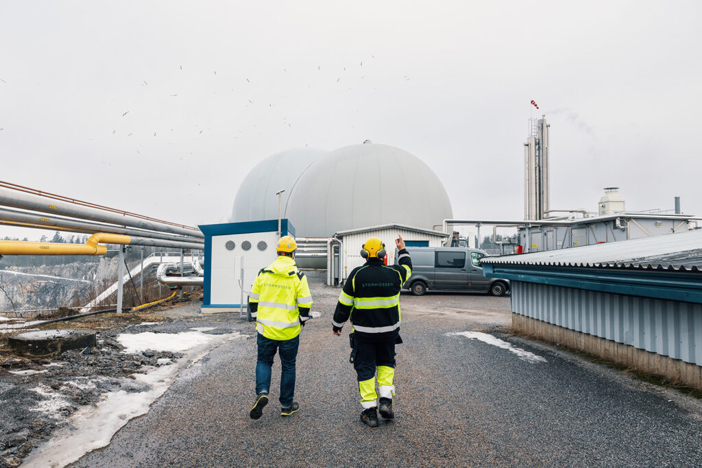 Biogasen samlas i de stora så kallade gasbol­larna som syns i bakgrunden.