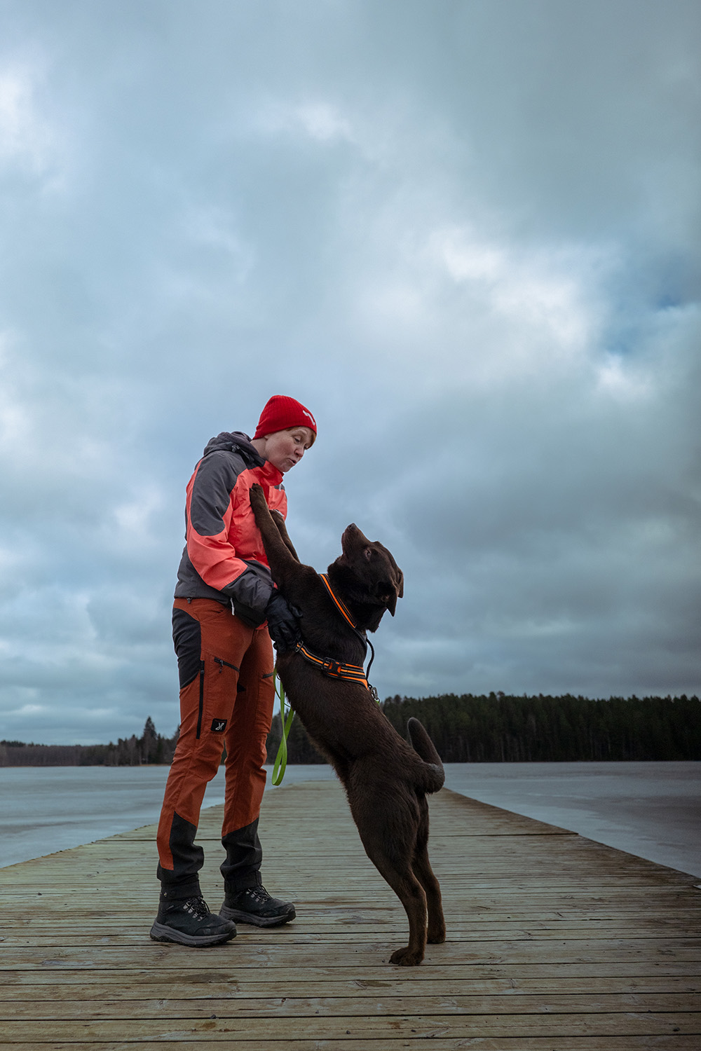 Nainen ja koira ulkona laiturilla