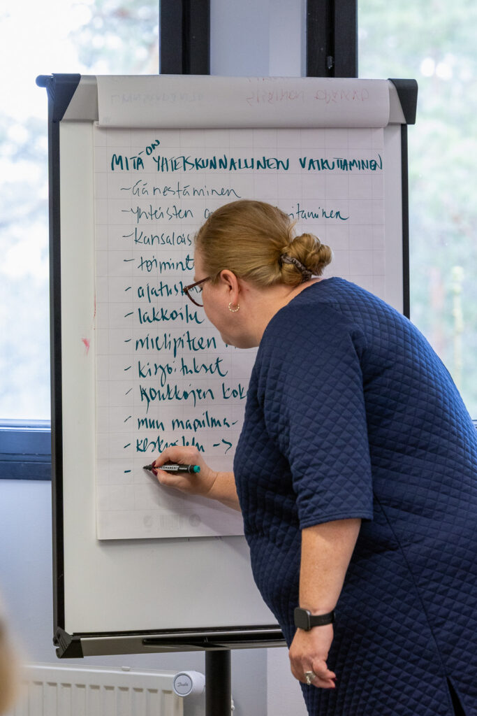 Ryhmäkeskusteluissa on juuri pohdittu, mitä kaikkea yhteiskuntavaikuttaminen voi olla. Taululle on kirjattu äänestäminen, kansalaisaloitteiden teko, mielipidekirjoitukset, keskustelun herättely, ehdokkainen evästäminen ja niin monta muuta asiaa, että tila meinaa loppua.